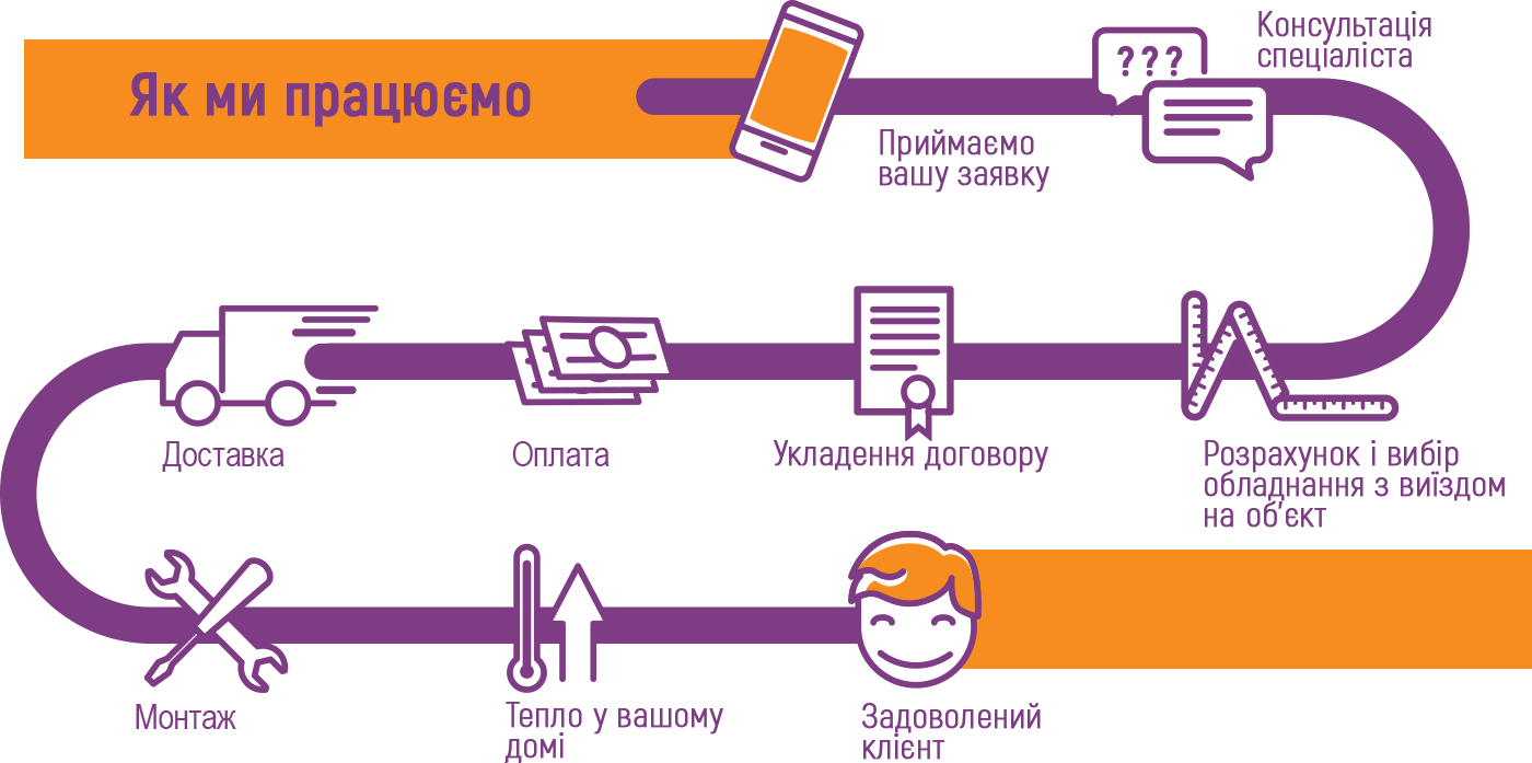 Надішліть заявку на сайті або по телефону – ми передзвонимо і проконсультуємо-Виїмо на об'єкт, якщо необхідно - безкоштовно зробимо розрахунок – укладемо з вами договір – ви вносите оплату – ми поставляємо і монтуємо систему опалення – у вас тепло і відмінний настрій